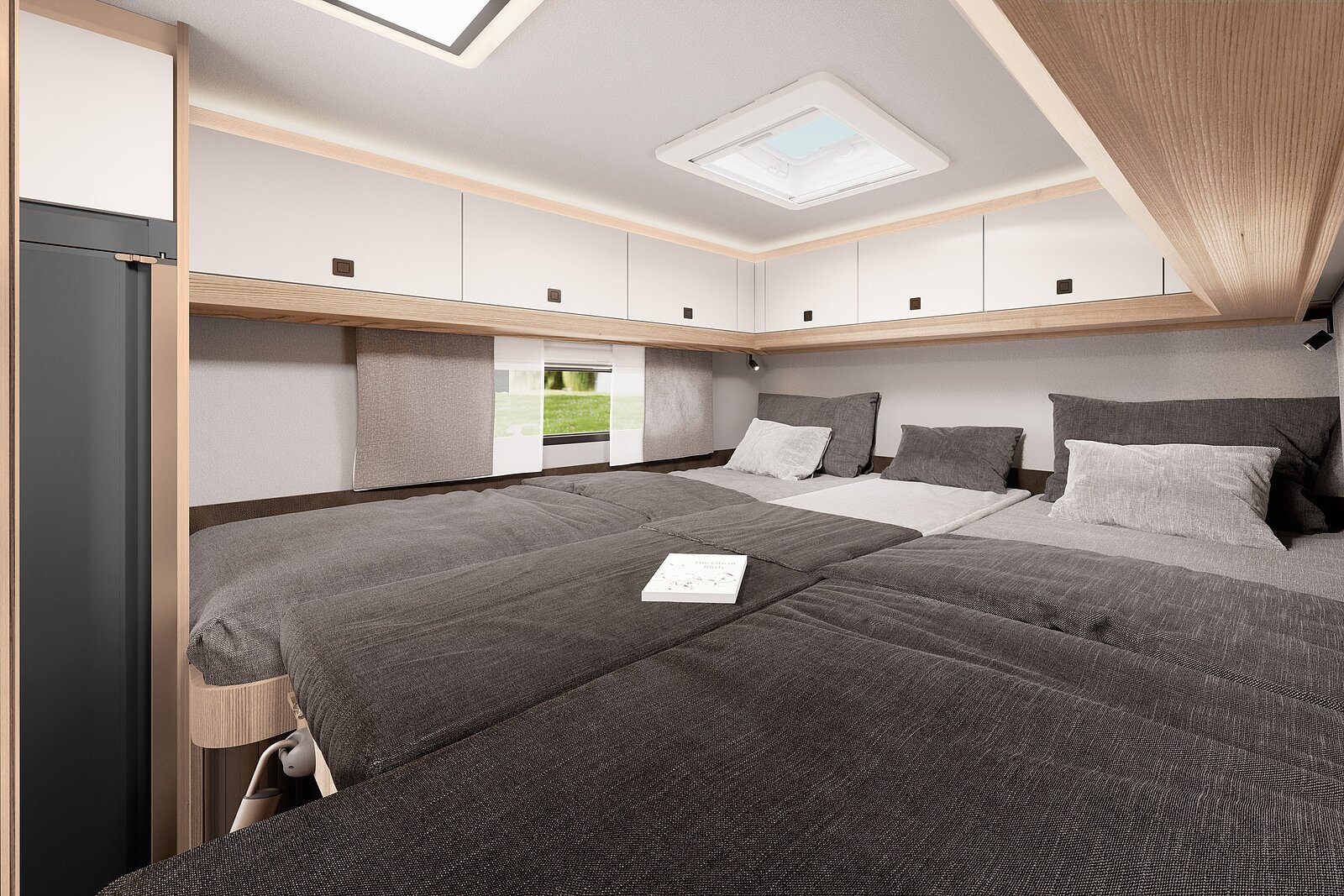 Eenpersoonsbedden of queensbed – achterin de ONTOUR C is alles voorzien voor een heerlijke nachtrust. De eenpersoonsbedden kun je op verzoek met de bedverbreding uitbreiden tot een ligvlak. Met een rugvriendelijke lattenbodem en hoogwaardige koudschuimmatrassen ben je ‘s morgens uitgerust en klaar voor een nieuwe dag.