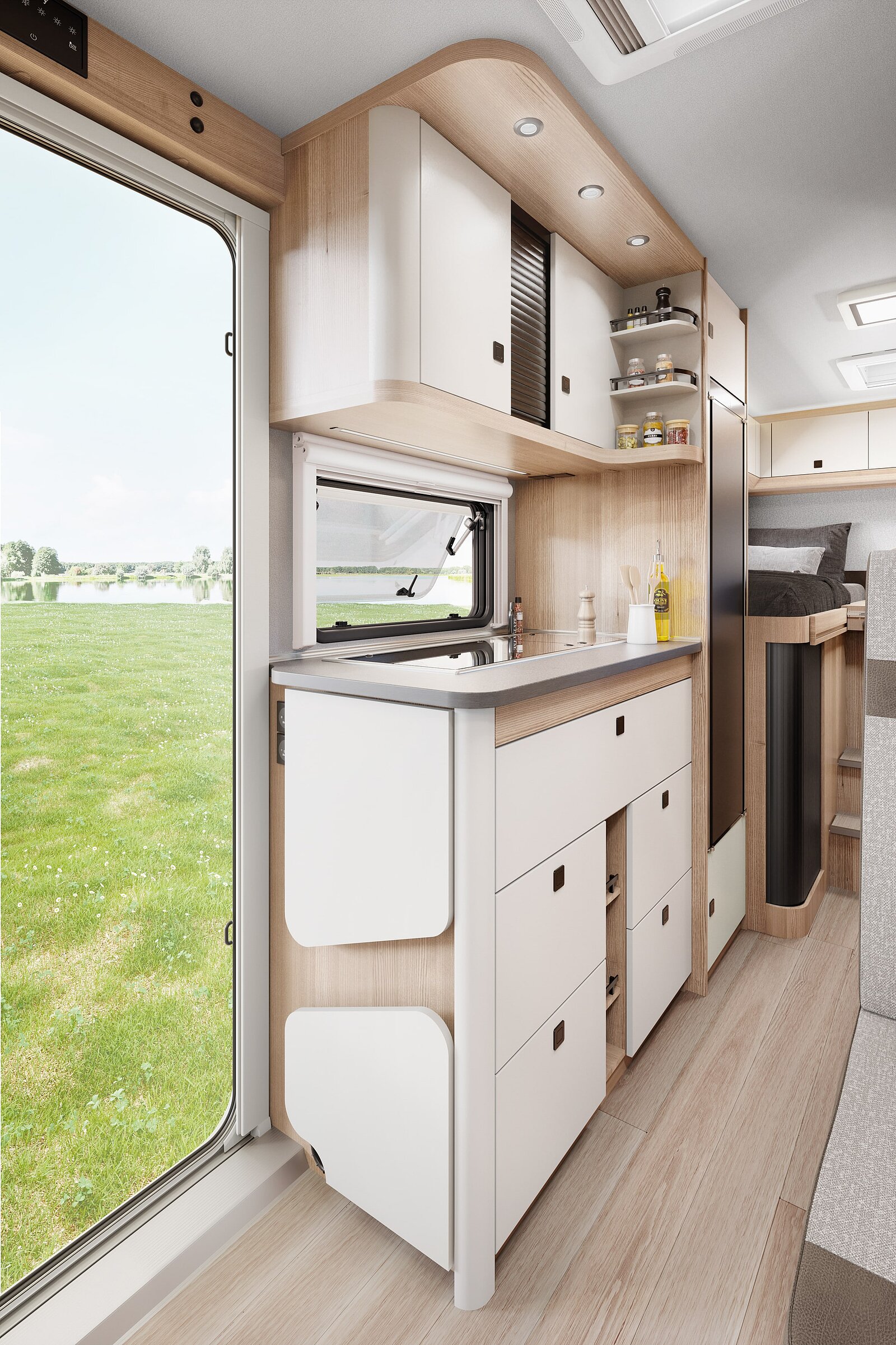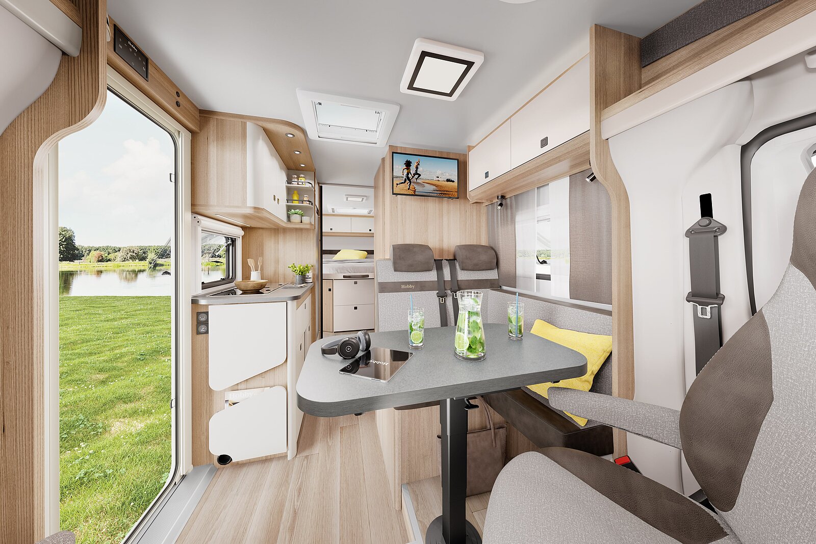 Licht, modern, in elk opzicht handig: in de ONTOUR C voel je je in je nopjes bij alles wat je doet. Terwijl je in de goed ingerichte keuken ‘s morgens je eerste kop koffie zet of ‘s middags een snack maakt. Wanneer je met je schatten in de gezellige zitgroep de dag overloopt. Of terwijl je heerlijk slaapt – en de dag start met een verkwikkende douche. Alles wat je hiervoor nodig hebt, heb je bij de hand dankzij de volledige uitrusting HobbyKomplett.