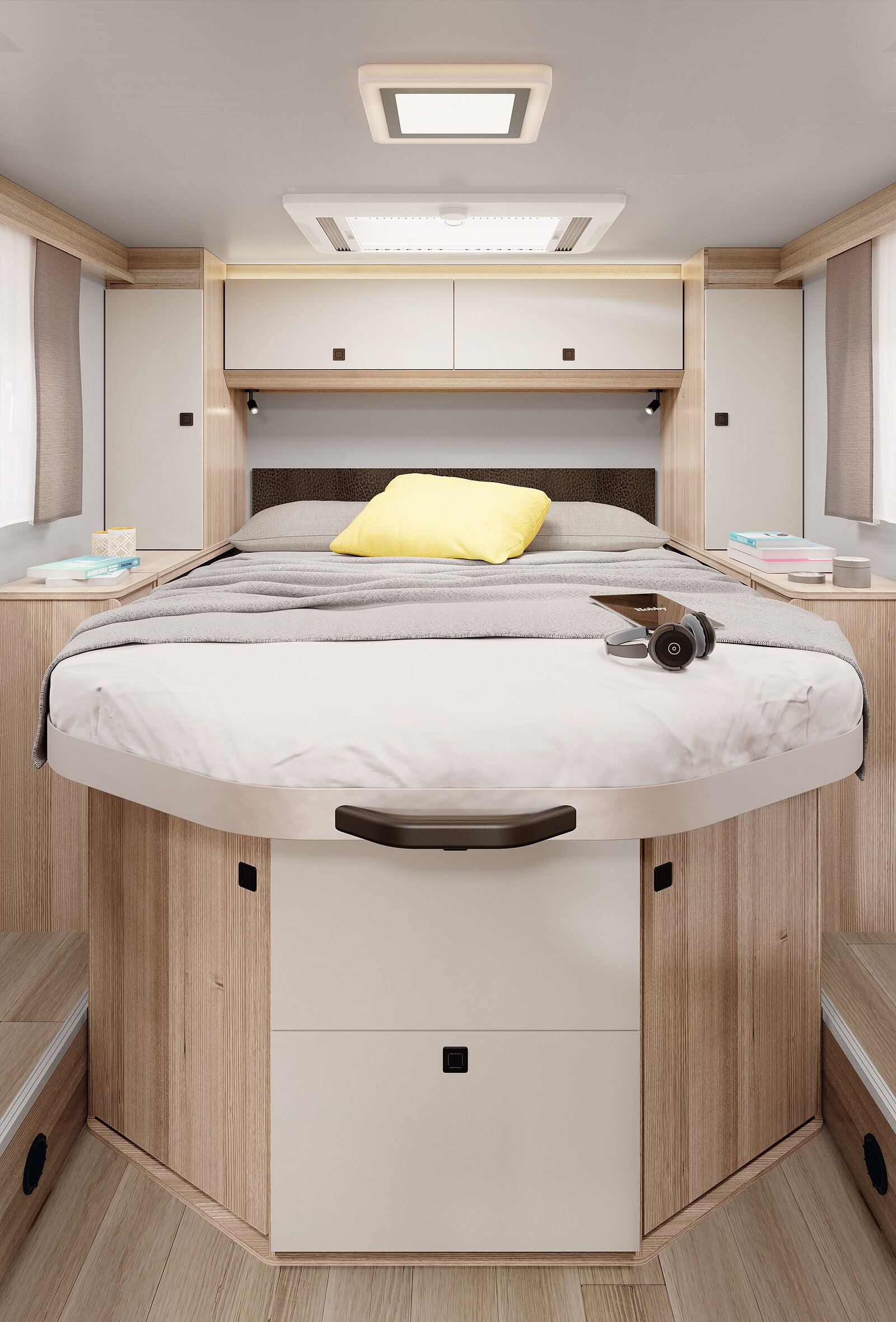 Je hebt keuze uit twee indelingen: het grote queensbed in de langere 700 GQ? Of liever knusse eenpersoonsbedden in de 680 GE? Daarvan maak je dankzij een bedverbreding een groot ligvlak over de hele breedte van het voertuig. Beide indelingen beschikken over een handige, multifunctionele badkamer met douche en een volledig ingerichte, voorname keuken.