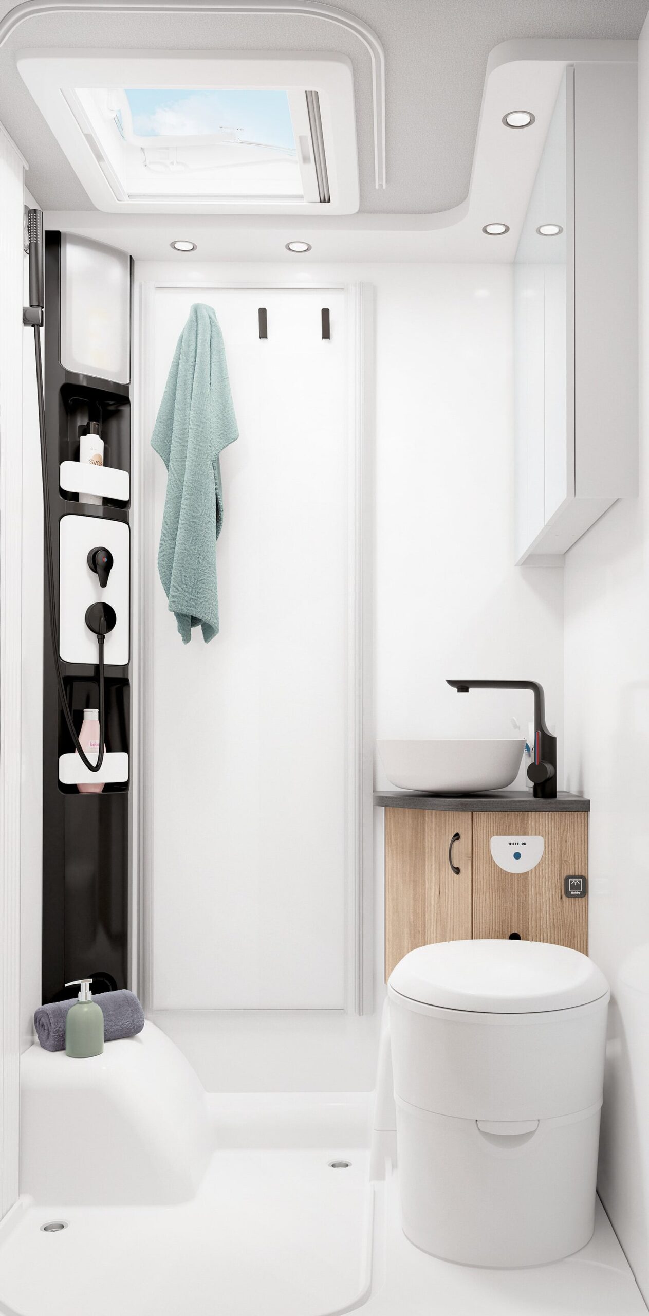 Alles erin, alles eraan – en bovendien uitgekiend en plaatsbesparend. De multifunctionele badkamer met douche, draaitoilet, wastafel en spiegelkast is doordacht, net als alles in je ONTOUR C. Het dakluik garandeert een perfecte verluchting en daglicht.