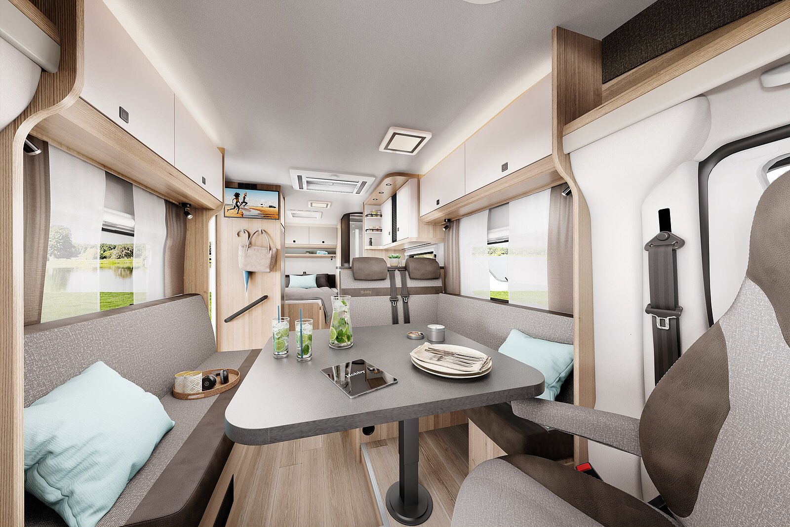De ONTOUR T is een veelzijdige allrounder op Fiat-chassis met een motor van 140 pk. De drie indelingen bieden bij een breedte van 2,40 m het gevoel van een open ruimte met veel plaats voor een grote, knusse L-vormige zitgroep en de volledige HobbyKomplett-uitrusting.