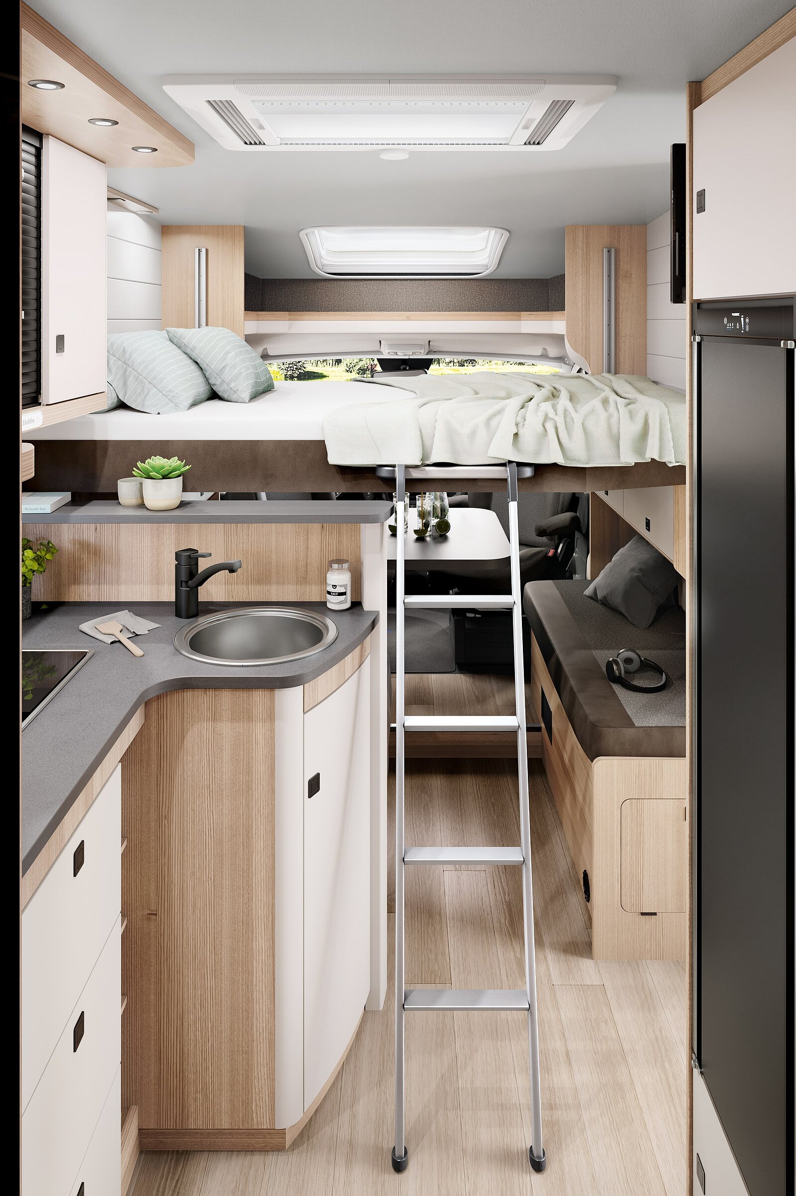 Een- of tweepersoonsbed, hefbed, stapelbed … hier vindt ieder iets om comfortabel te slapen. Met gezellige sfeerverlichting en eigen leesspots kun je de dag uitwuiven. ‘s Nachts zorgen aanpasbare lattenbodems van GOODSIDE en hoogwaardige koudschuimmatrassen dat je rug kan ontspannen. Kleine passagiers hebben een slaapplekje in het stapelbed achterin, dat tijdens de rit een grote garage wordt.