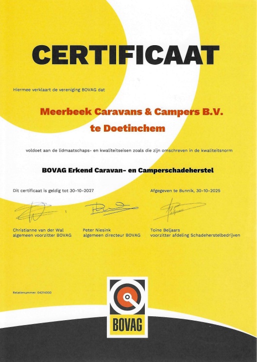 Het BOVAG Erkend Schadeherstel certificaat is hét keurmerk binnen de caravan- en camperbranche voor betrouwbaar, veilig en professioneel schadeherstel. Bedrijven met dit keurmerk voldoen aan de “Kwaliteitsnorm BOVAG Erkend Schadeherstel,” een norm die is vastgesteld door de branche en getoetst door onafhankelijke instanties zoals Kiwa.